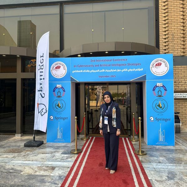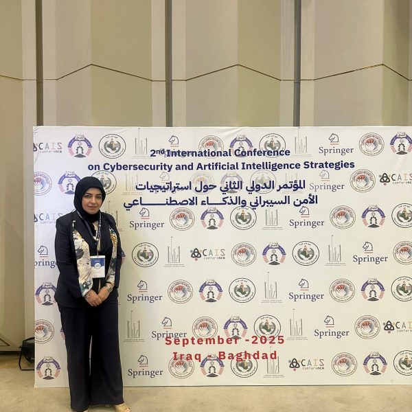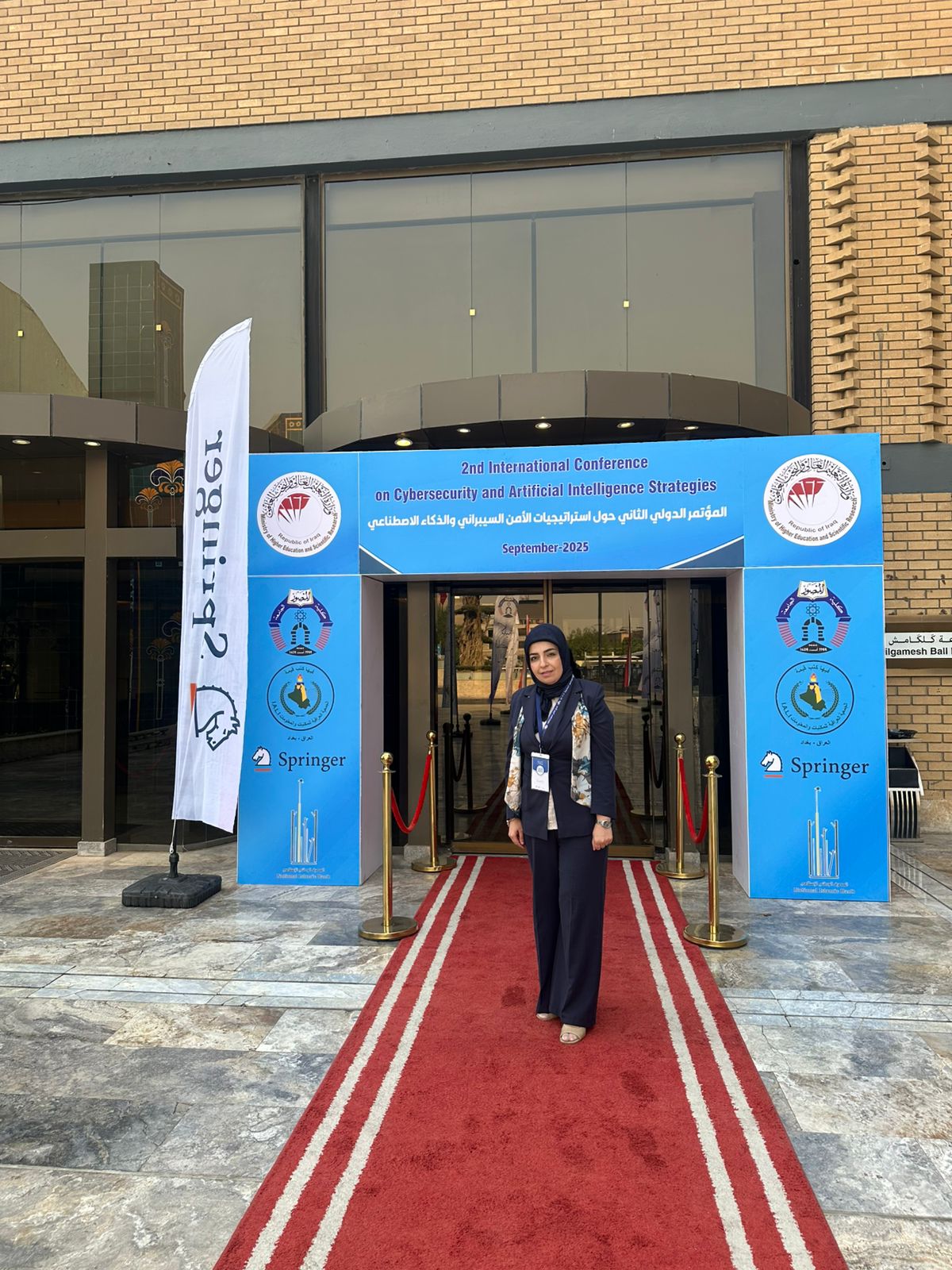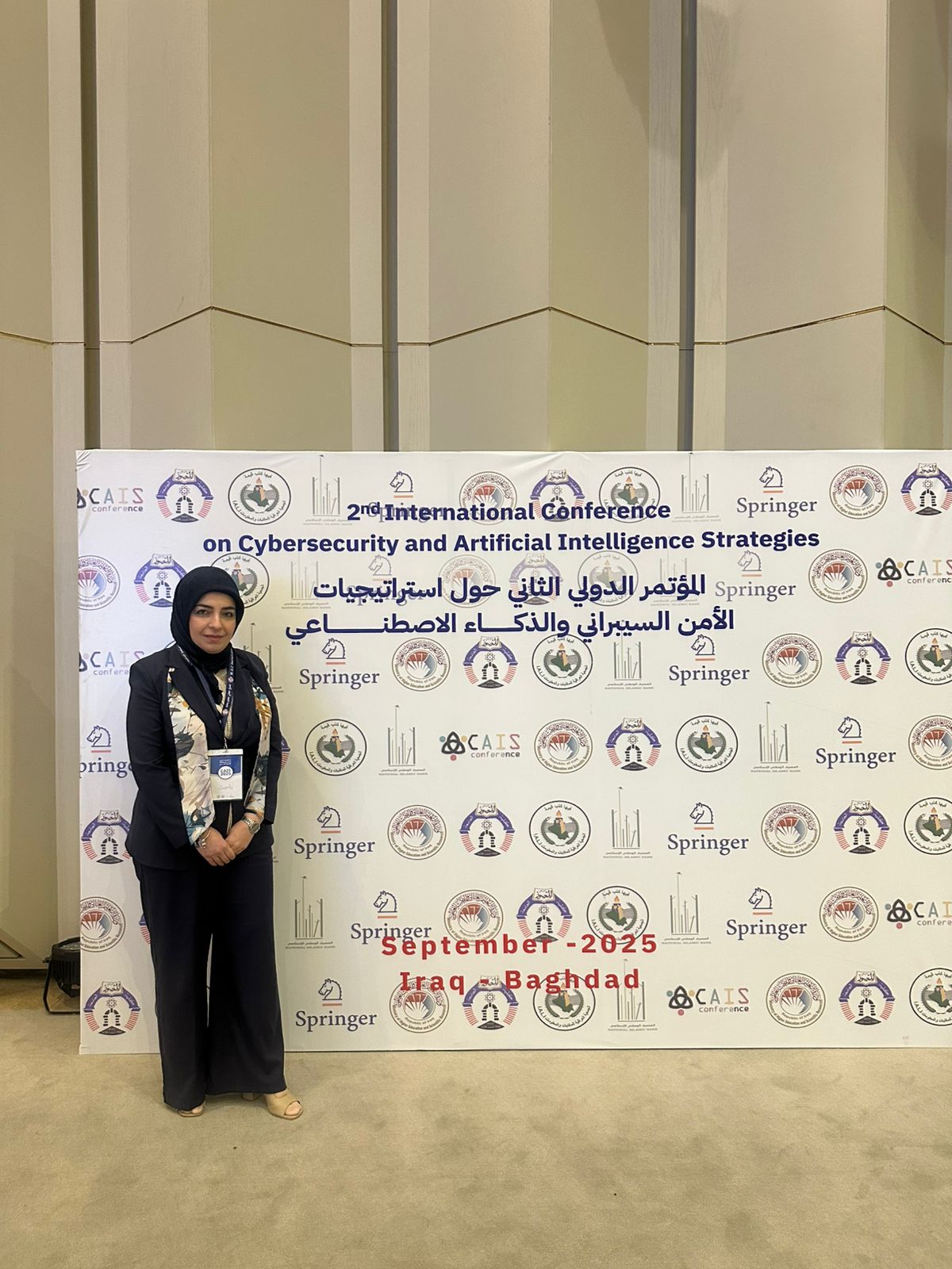 شاركت الأستاذ المساعد الدكتورة هبة محمد فاضل، رئيس قسم علم البيانات في كلية التميز – جامعة بغداد، في المؤتمر الدولي الثاني حول الأمن السيبراني والذكاء الاصطناعي: استراتيجيات ترسم المستقبل، الذي نظمته كلية المنصور الجامعة بالتعاون مع دار النشر العالمية Springer، وذلك في فندق بابل – بغداد يومي 17 و18 أيلول 2025.