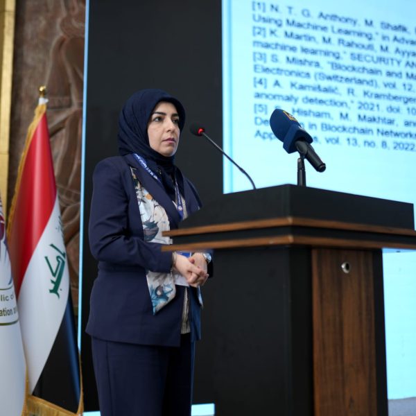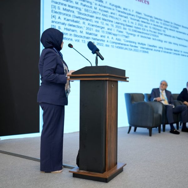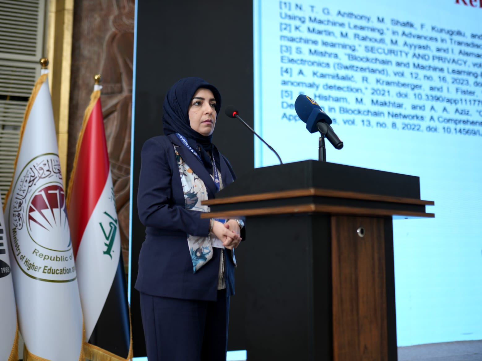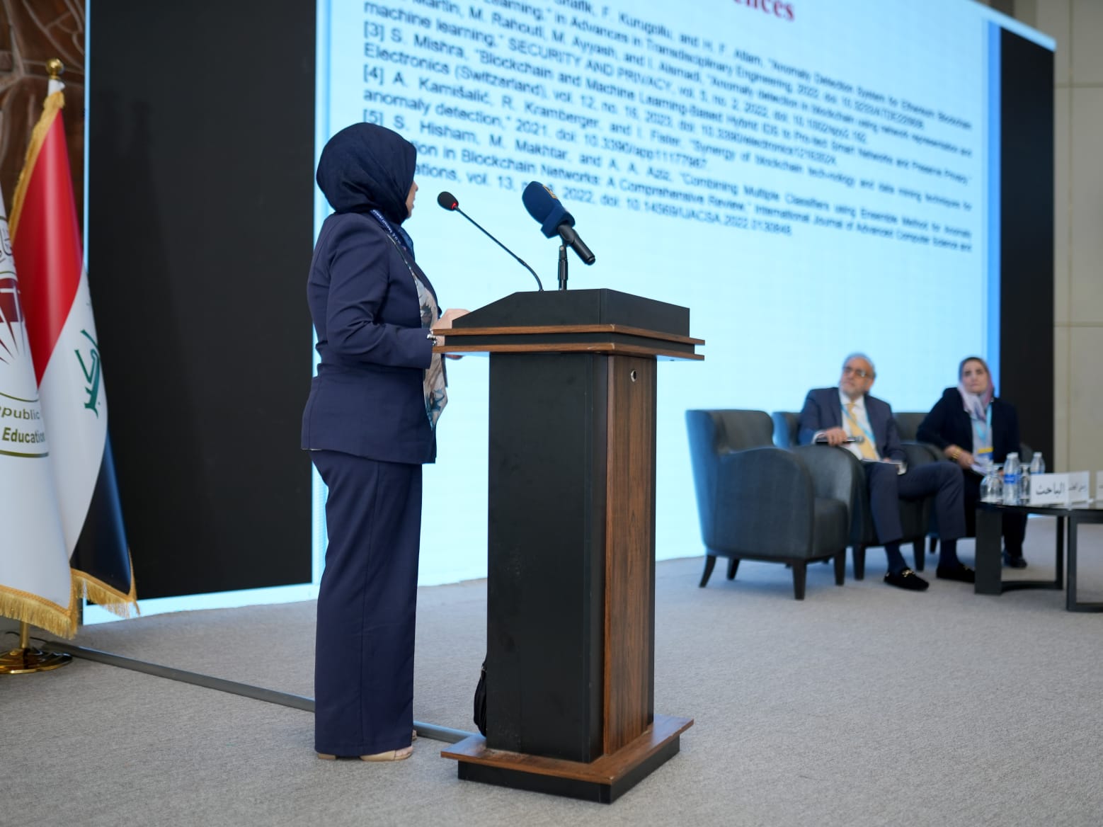 وقدّمت الدكتورة هبة محمد فاضل خلال المؤتمر ورقة بحثية علمية تناولت توظيف تقنيات الذكاء الاصطناعي وتعلم الآلة لاكتشاف الهجمات السيبرانية على شبكات البلوكشين، وبشكل خاص هجمات 51% والمعاملات الاحتيالية، حيث جرى تحليل أداء نماذج SVM وRandom Forest ضمن بيئة بيانات واقعية.