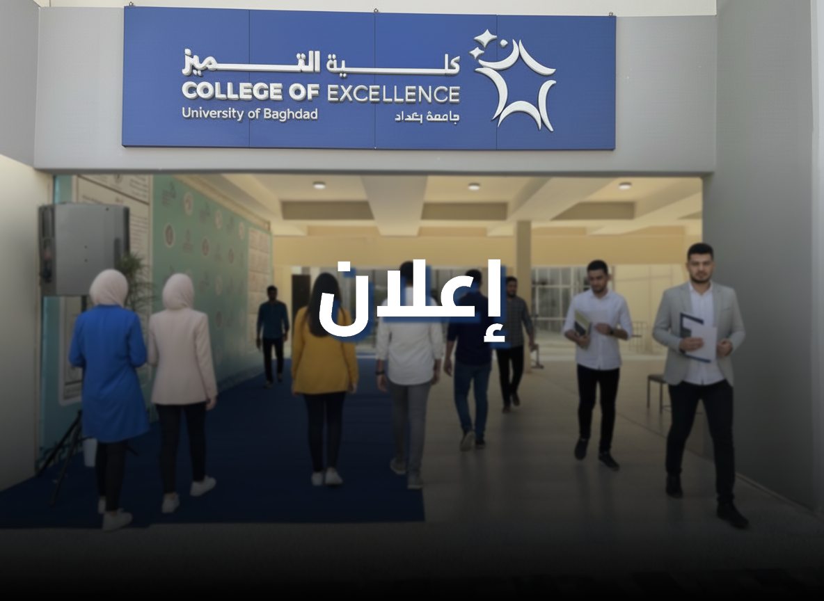 من أجل إتاحة الفرصة أمام طلبة الدورين الأول والثاني للتقديم ، تُعلن جامعة بغداد عن إعادة فتح الامتحان الوطني للقبول وفق الحدود الدنيا في كلية التميز ، ابتداءً من: يوم الأحد 5/10/2025 الساعة 1:30 ظهرًا ، ويستمر خلال أيام: الاثنين، الثلاثاء، الأربعاء، الخميس، الساعة 12:00 ظهرًا (في الجامعات الحكومية حصراً) .