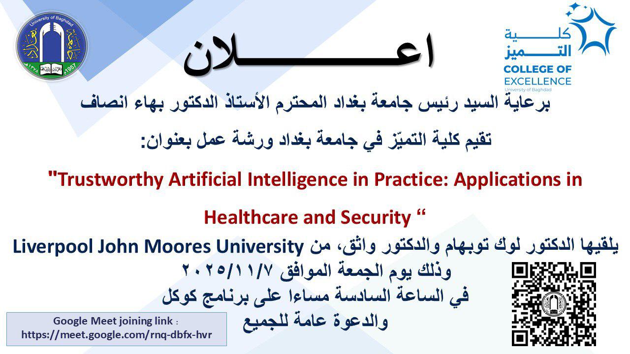 يسرُّ كلية التميز في جامعة بغداد دعوتكم للمشاركة في ورشة العمل التي ستُقام يوم غدٍ الجمعة الموافق 7-11-2025 في تمام الساعة السادسة مساءً عبر برنامج Google Meet.
